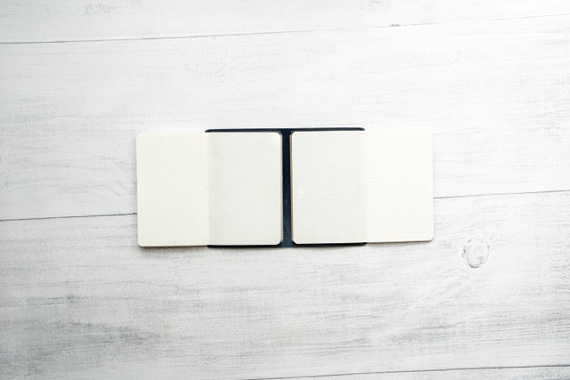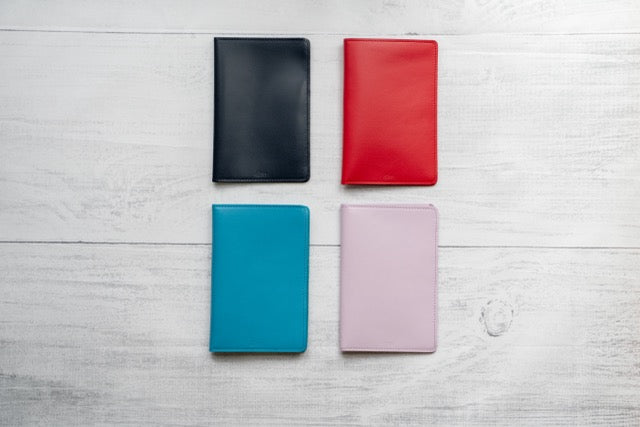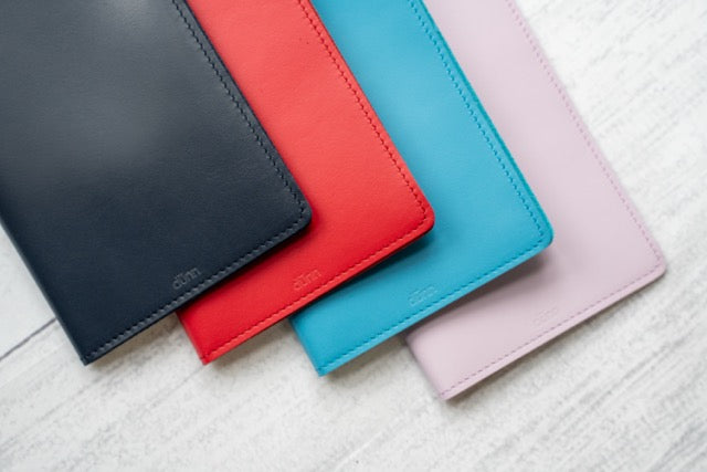 一枚の革に二枚の差し込み革を縫い付けたシンプルな構造で、左右からノートを挿し込めば、開いたときに両方のページを同時に閲覧・書き込みできます。dünn自慢の極薄本革を使用し、重量はわずか20〜25gと驚きの軽さ。カラーは4色展開で、1冊だけの使用や内側からの挿入も可能な自由度の高い設計です。