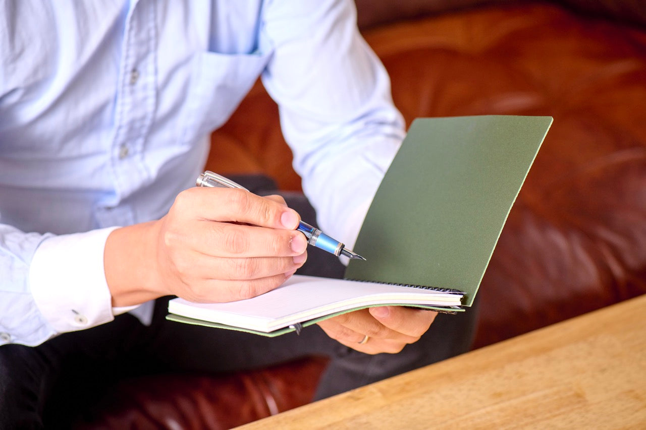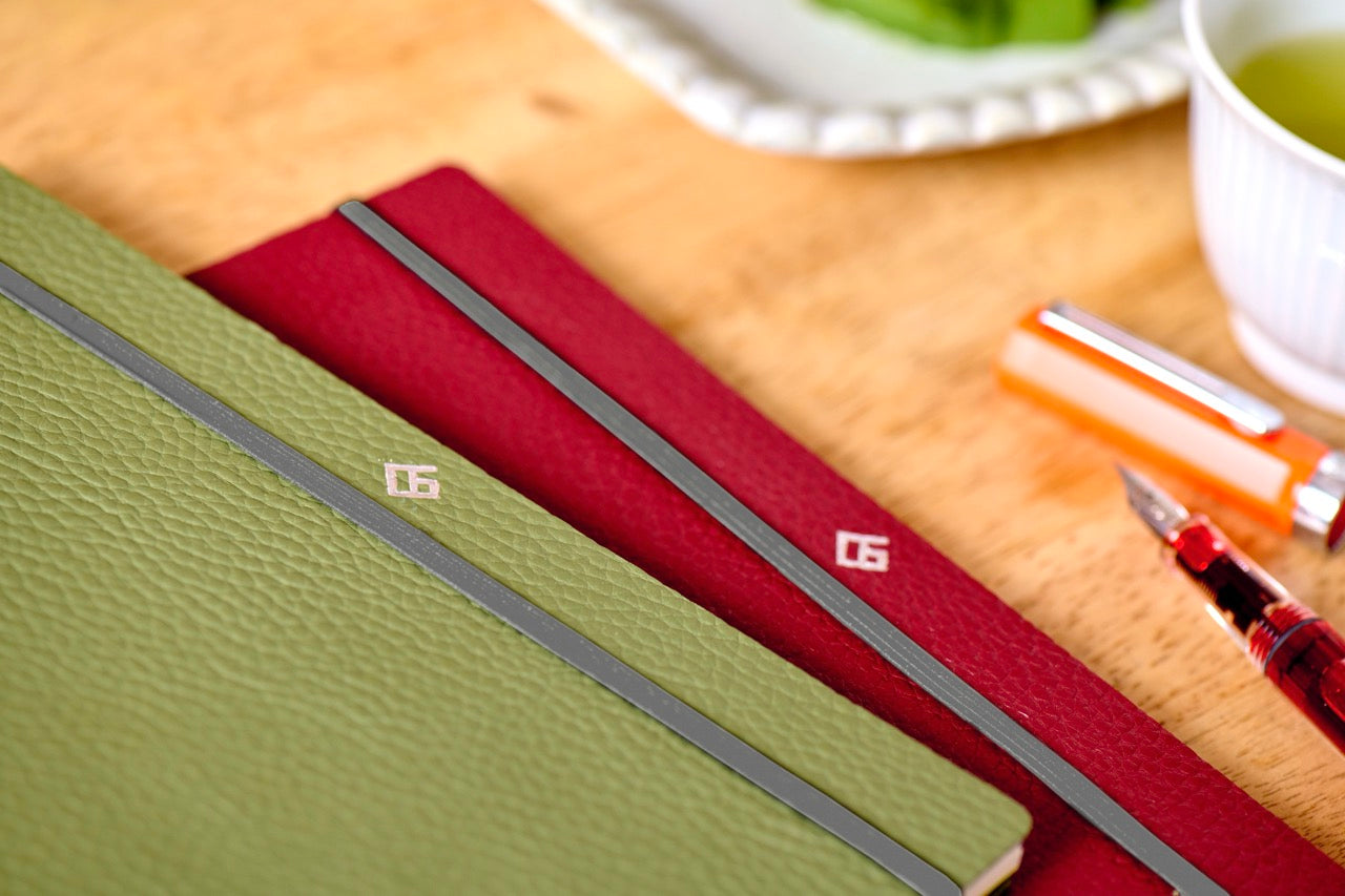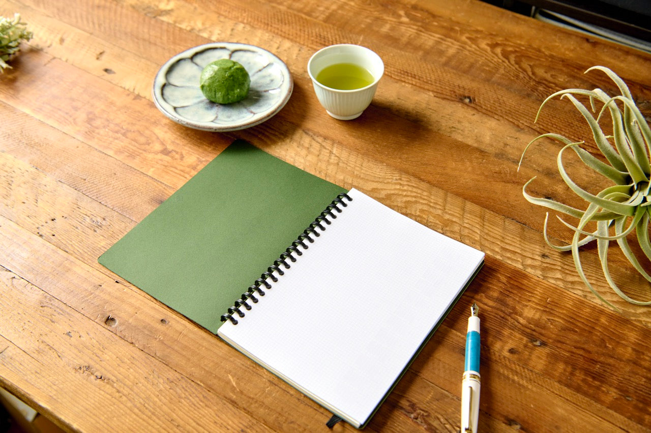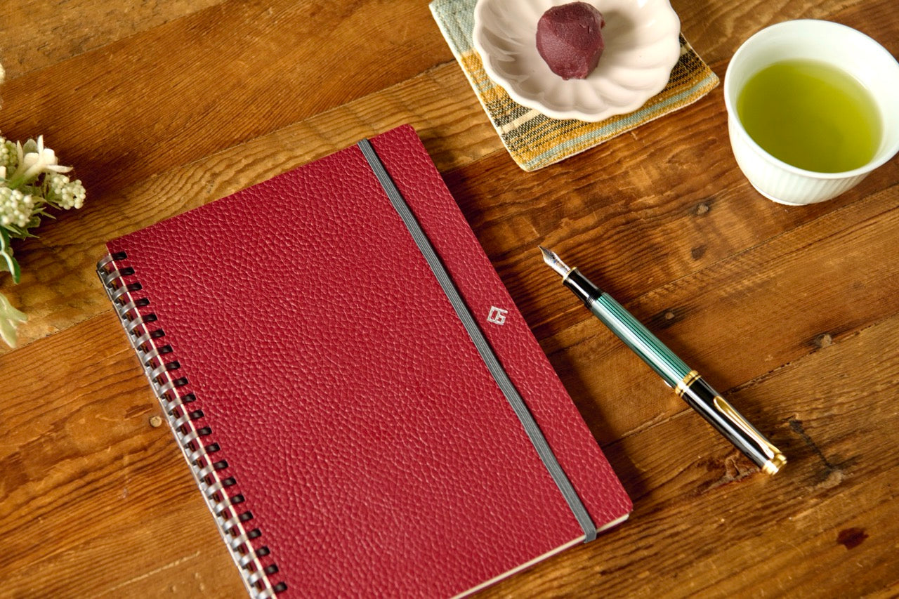 表紙には国産の姫路レザーを採用。手触り、風合いの良いシボありの本革は使い込むほどに手に馴染みます。裏側に特殊紙を張り合わせることにより表紙の硬さを保ち、ノートとして使いやすいハリ感を生み出します。